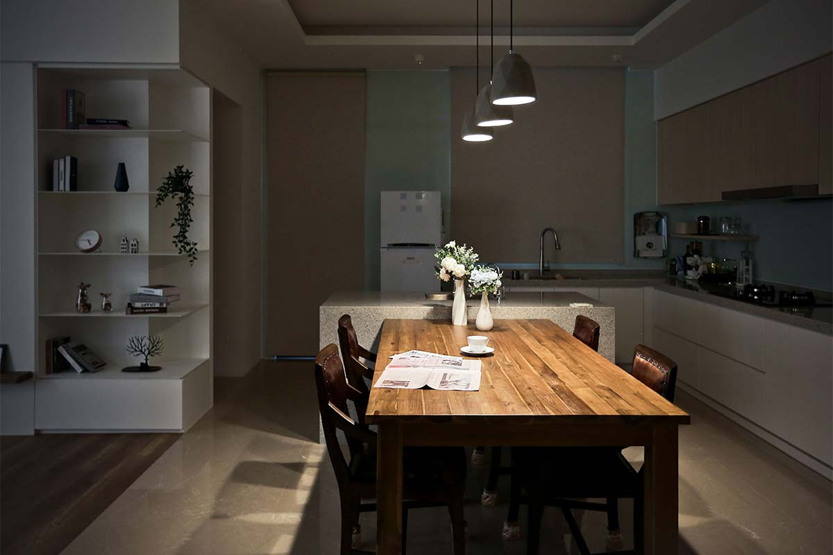 廚房場域收納櫃體特別規劃斜面層板,提供不同尺寸鍋具置放兼展示功能,以色彩繽紛鍋具點綴餐廚焦點,打造趣味巧思烹調空間。全室透過材質、光線詮釋不同場域的獨特氛圍,勾勒出周末夫妻悠閒料理、品嘗咖啡的清靜度假宅。